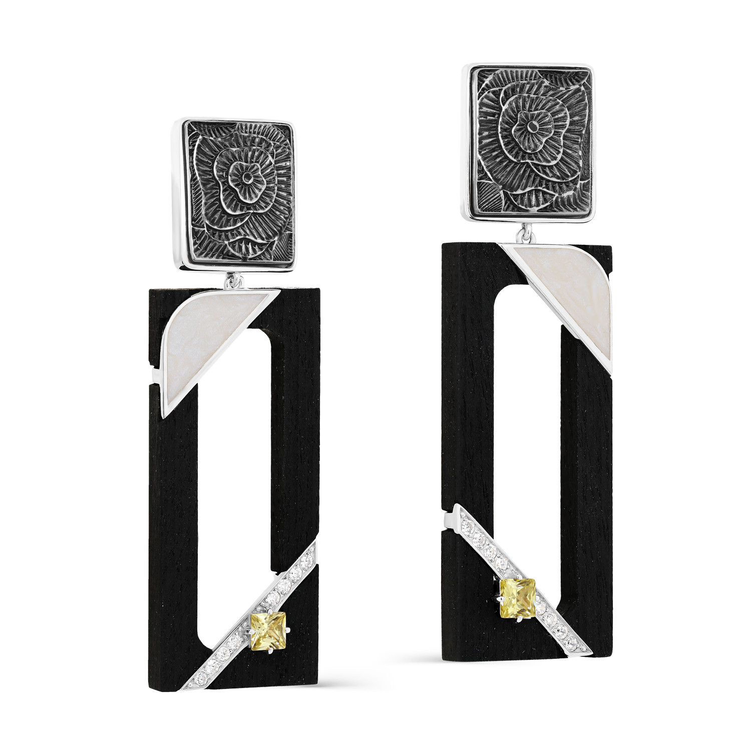 Серьги из серебра с фианитами, деревом граб и эмалью
