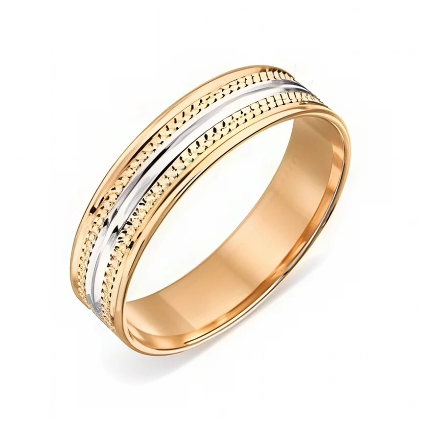 Обручальное кольцо, выполненное из двух видов золота 585 пробы. Основная часть выполнена из красного золота, середина из белого. Особую оригинальность модели придает сочетание глянцевой яркой поверхности в виде проточки в середине кольца с сатиновой приглушеной в сочетании с алмазными гранями.
