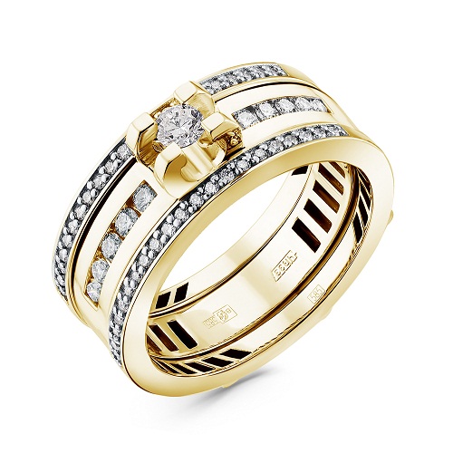 Обручальное кольцо из жёлтого и белого золота 585 пробы с бриллиантами..Ювелирный шедевр с лаконичной формой и искусной инкрустацией бриллиантами на внутреннем и внешнем кольцах.. Легко разделяясь на две равноправные части, словно два в одном, кольцо-трансформер само предлагает Вам варианты к удачному использованию: его можно носить как помолвочное, обручальное или обрамленное в роскошный бриллиант кольцо счастливой женщины.
